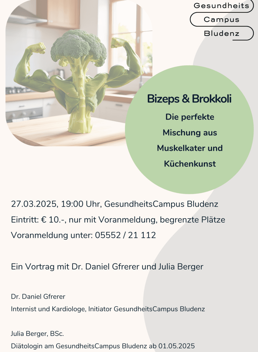 Am 22.05.2025 um 19:00 Uhr laden wir dich herzlich zum interdisziplinären Vortrag „Bizeps & Brokkoli“ am GesundheitsCampus Bludenz ein. Gemeinsam mit Dr. Daniel Gfrerer (Internist & Kardiologe) und Julia Berger, BSc (Diätologin) erfährst du, wie Training und Ernährung Hand in Hand gehen, um deine Gesundheit und Leistungsfähigkeit zu optimieren.